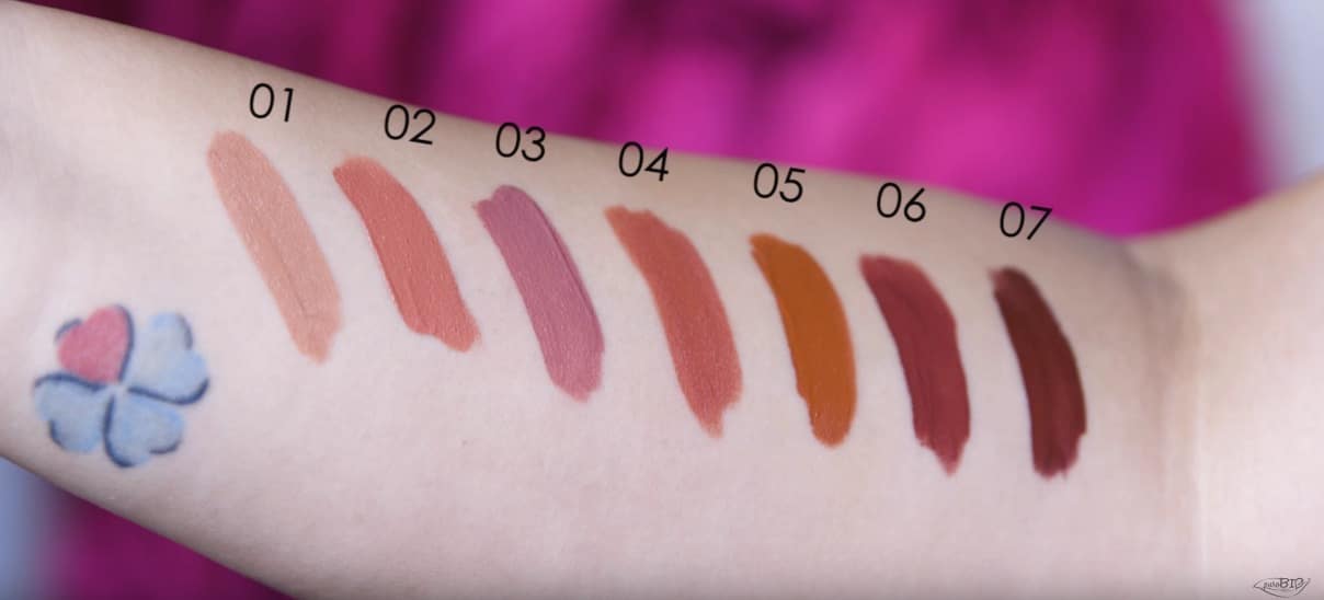La formula è stata studiata per garantire un’elevata coprenza ed un effetto vellutato e confortevole sulle labbra. Nella composizione di queste tinte sono presenti Silica e Amido di Mais Biologico, che rendono il finish delle tinte matte e permettono di asciugarsi rapidamente sulle labbra. Inoltre la formulazione è arricchita dalle Antocianine, che hanno permesso, assieme ai pigmenti minerali, di realizzare 7 diverse nuances totalmente Vegan.