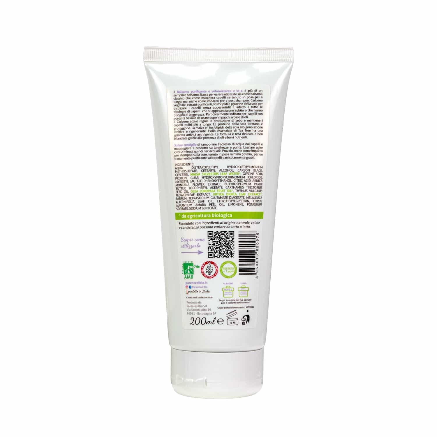 Balsamo purificante volumizzante con carbone vegetale, cartamo, ortica, timo, tea tree oil e olio essenziale di arancio amaro (in collaborazione con Torretta) è formulato con il 99% di ingredienti di derivazione naturale e di origine biologica.