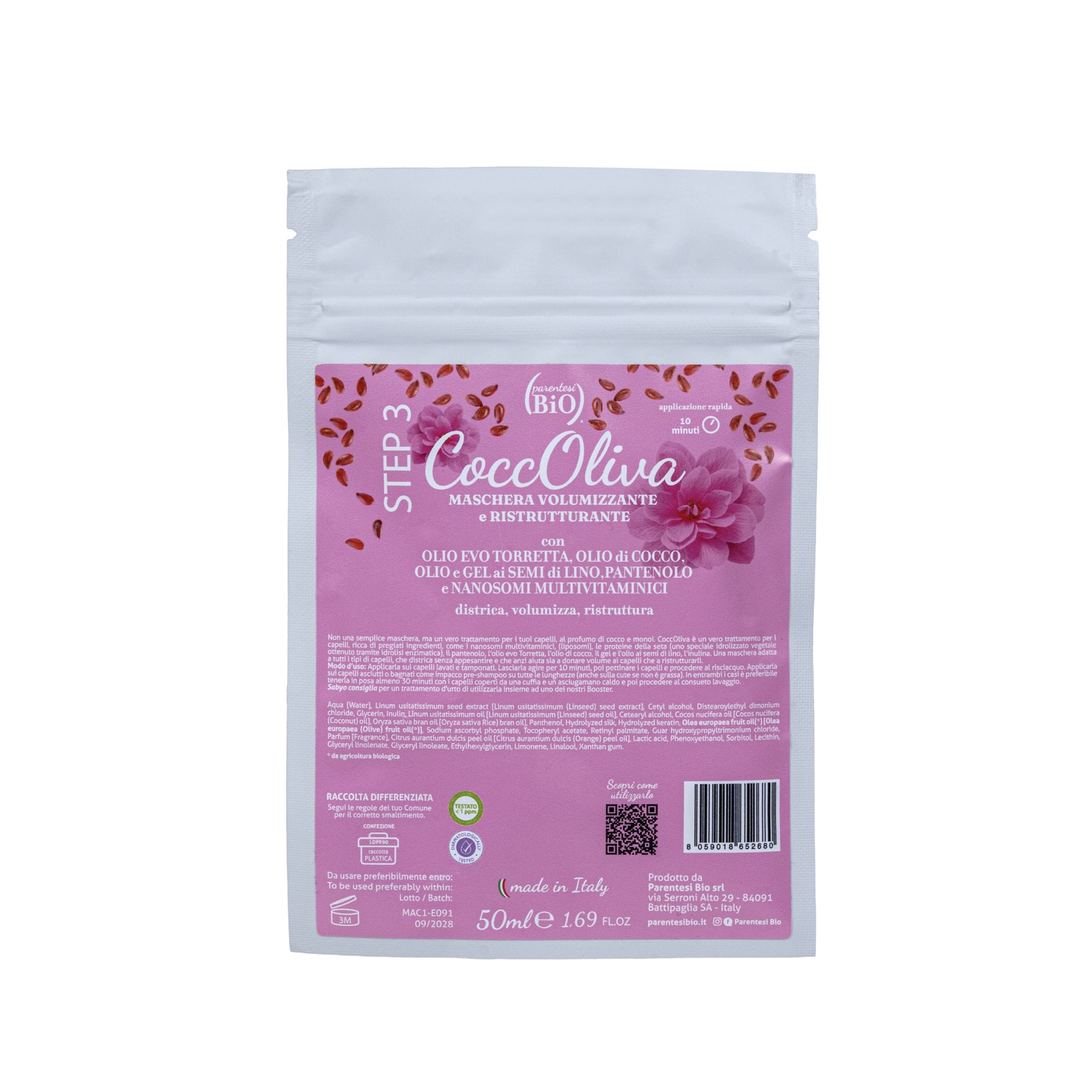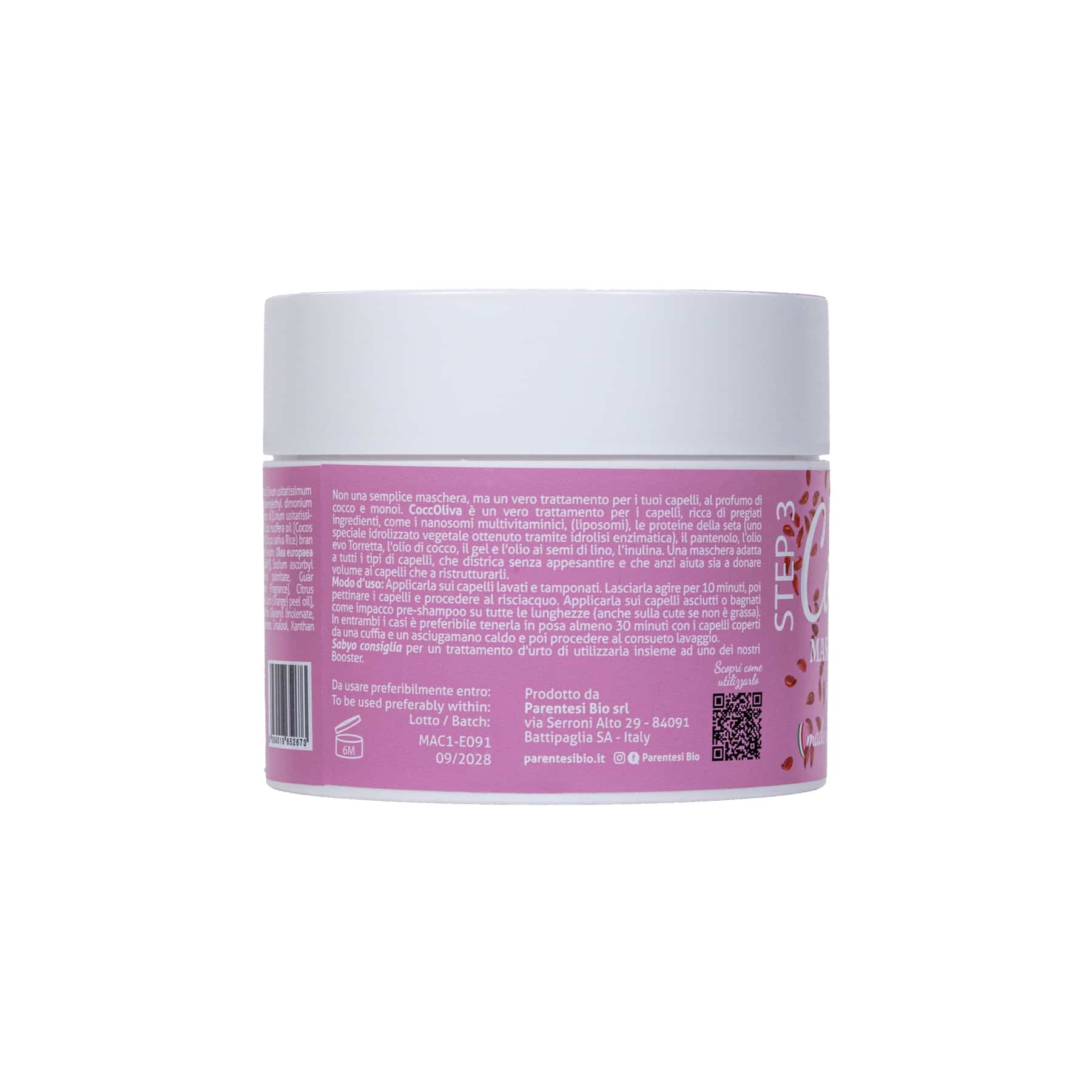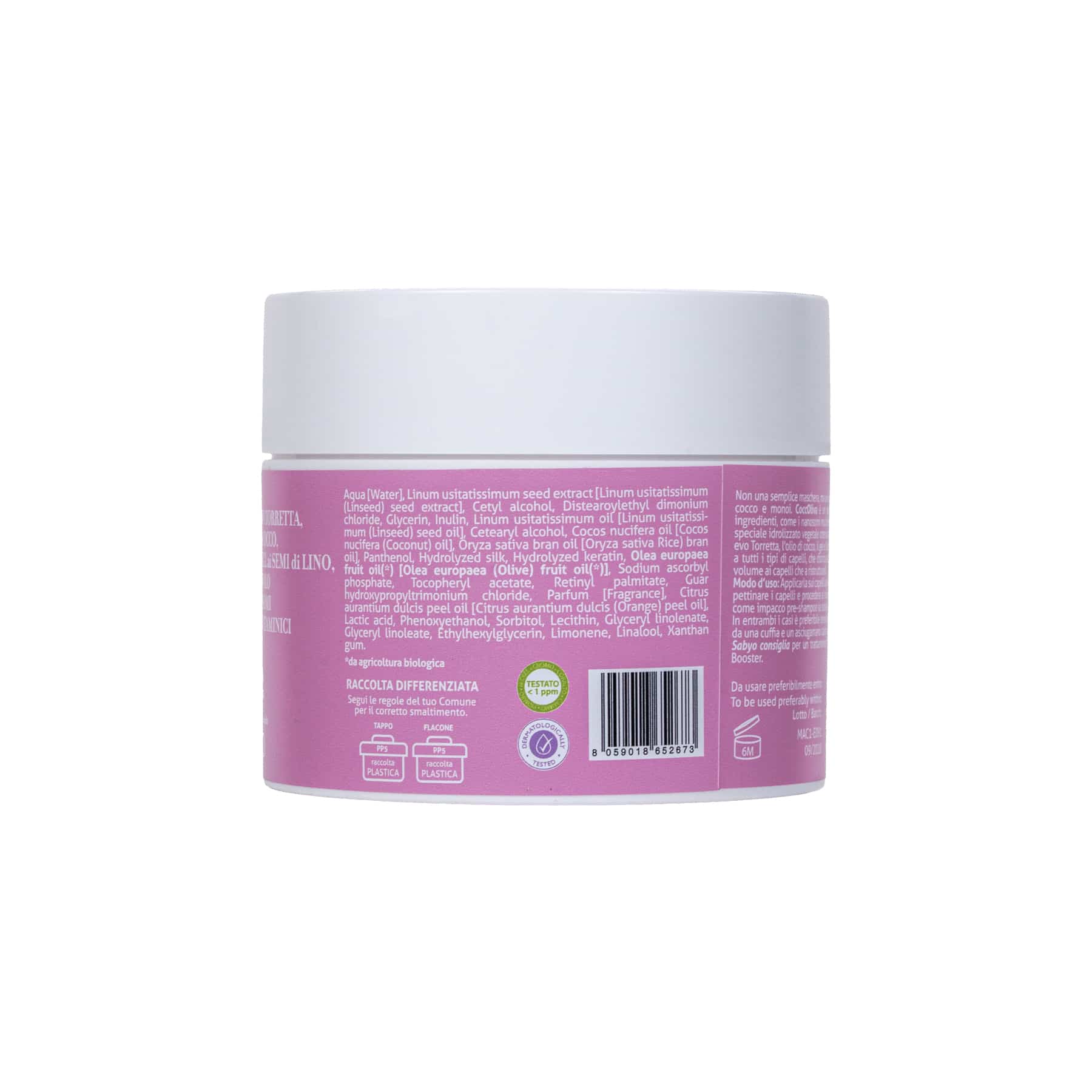 CoccOliva è un vero trattamento per i capelli, ricca di pregiati ingredienti, come i nanosomi multivitaminici, (liposomi), le proteine della seta (uno speciale idrolizzato vegetale ottenuto tramite idrolisi enzimatica), il pantenolo, l’extravergine di oliva bio, l’olio di cocco,  il gel e l’olio ai semi di lino, l’inulina … che hanno dato vita ad una maschera che fosse adatta a tutti i tipi di capelli, che districasse senza appesantire e che anzi aiutasse sia a donare volume ai capelli che a “ricostituirli”.