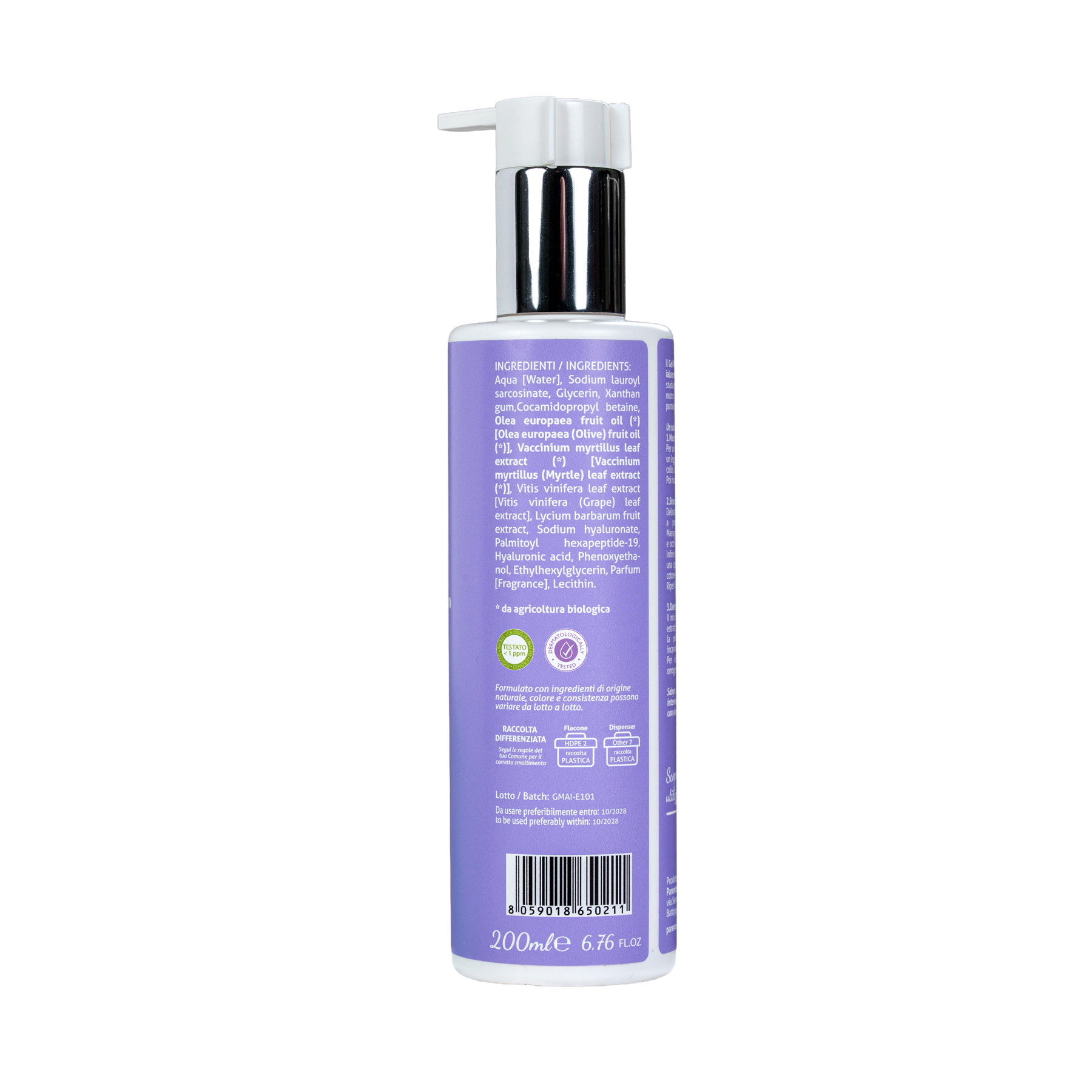 Aqua [Water], Sodium lauroyl sarcosinate, Glycerin, Xanthan gum, Cocamidopropyl betaine, Olea europaea fruit oil (*) [Oleaeuropaea (Olive) fruit oil (*)], Vaccinium myrtillus leaf extract (*) [Vaccinium myrtillus (Myrtle) leaf extract (*)], Vitis vinifera leafextract [Vitis vinifera (Grape) leaf extract], Lycium barbarum fruit extract, Sodium hyaluronate, Palmitoyl hexapeptide-19,Hyaluronic acid, Phenoxyethanol, Ethylhexylglycerin, Parfum [Fragrance], Lecithin.